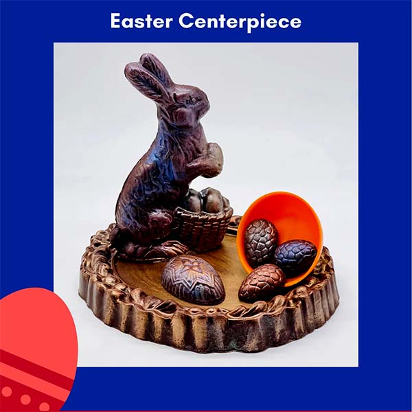 An artistic composition of hand painted dark chocolate bunny, eggs and a scroll tray to create a stunning masterpiece for the holiday.