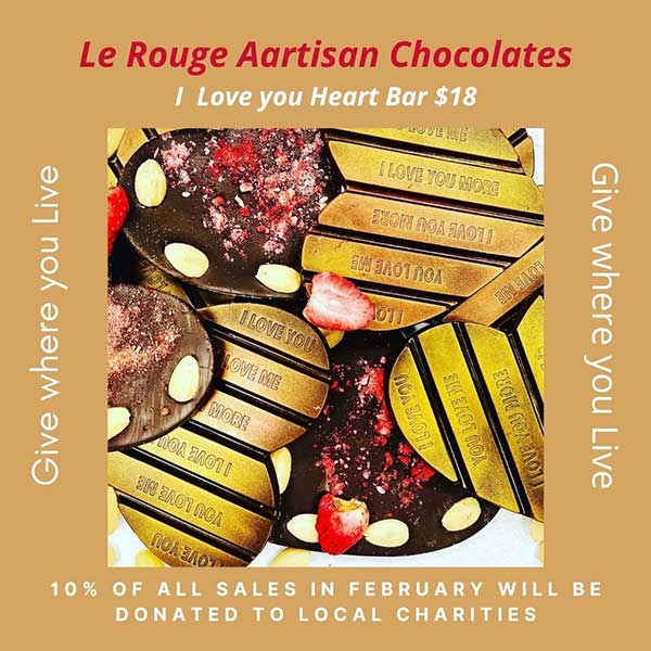 Stop in at Le Rouge to pick any of our chocolate creations packaged in a Red Heart Box and share it with someone in our community who least expects it and spread love through random acts of kindness.